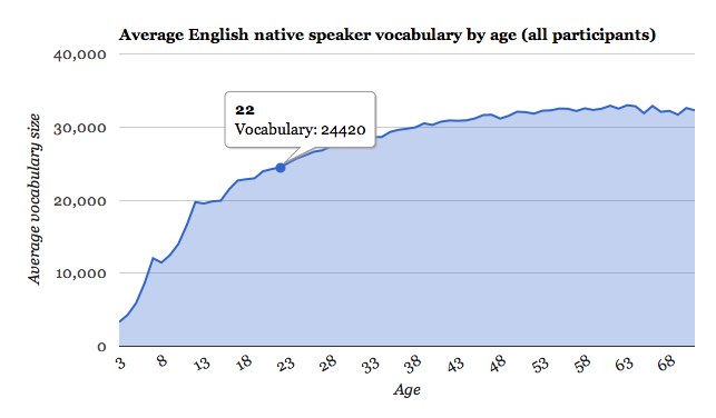 英語ネイティブ、英語の学習者の両者を含め20万人がこのテストを受けており、統計から現在の自分の単語数がネイティブであれば何歳にあたるのか、SATレベルではどのくらいかをコチラのページのグラフで見ることができます。テストの結果、私の語彙数は20,600語でした。こちらのサイトでは派生語等を含まない語彙サイズが測定されており、英語学習者の平均は2,500から9,000語、英語ネイティブは20,000から35,000語とのことです。